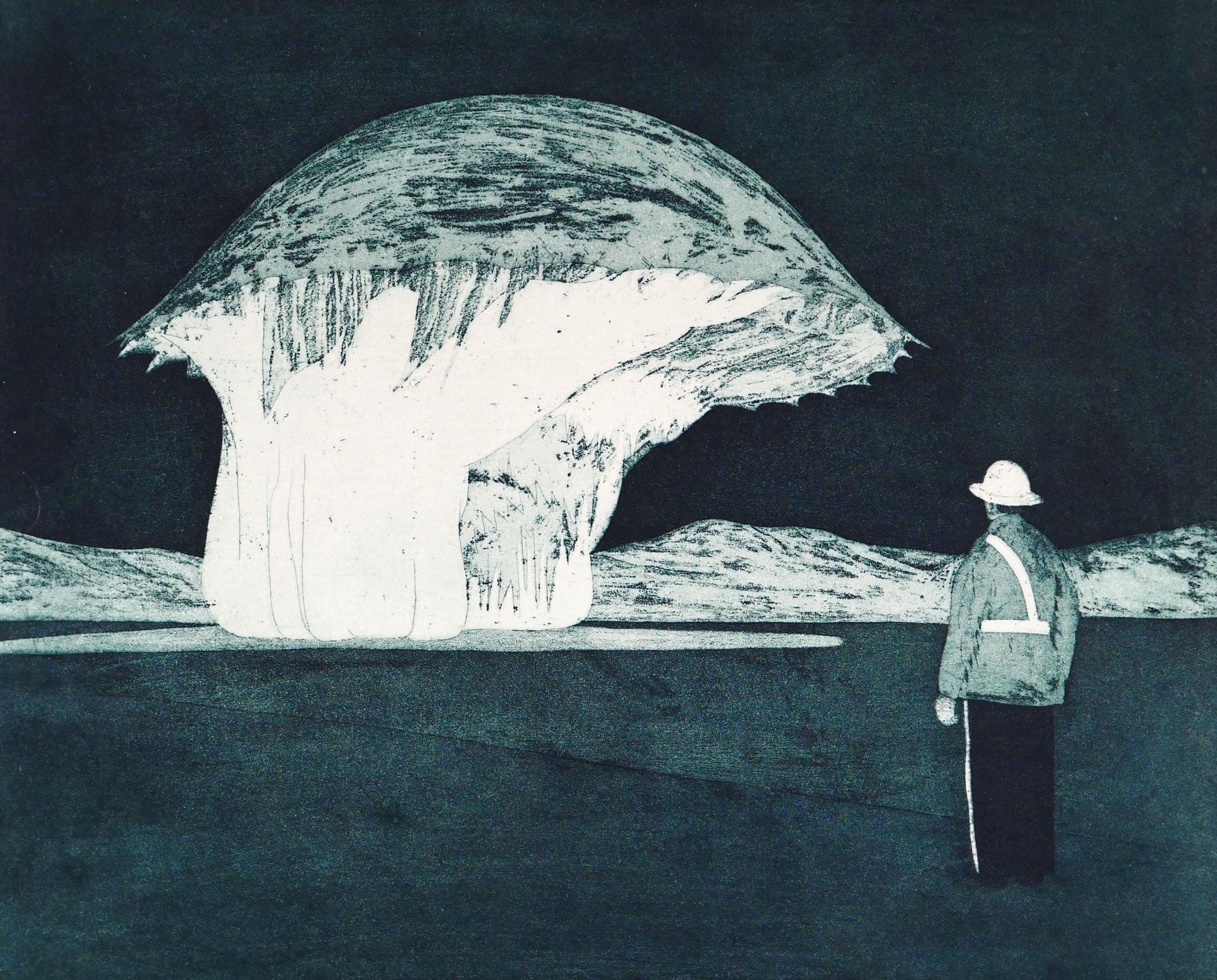Dans cette série de gravures à l'eau-forte et aquatinte, Pierre Emile Moulin orchestre des face-à-face entre des silhouettes solitaires et des objets flottant dans l'espace. Le personnage, souvent représenté en contre-jour, contemple, interpelle ou interagit avec ces présences surréalistes, créant ainsi une tension dramatique entre le familier et l'extraordinaire.